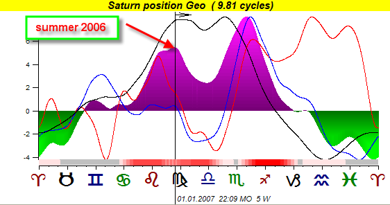 It shows the CPI changes in regards to Saturn position in the sky. You see there three colored lines. These are Saturnian cycles calculated for three independent data intervals. Sometimes all three lines show the same tendency. At these times, we have a strong confidence as to relevantness of this cycle. These are red zones at the bottom (I call them active zones, and I would take into account the info only from these zones).