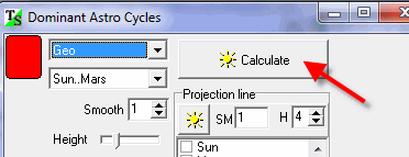 Third, you can calculate the projection line based on the most resent dominant cycles. Simply define here the cycles you want to take into account (Mars in our example) and click this button: