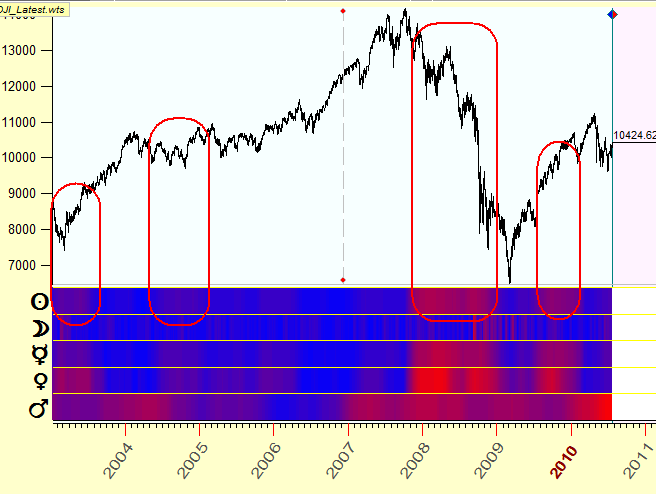 First of all pay attention to the most resent strong astro cycle (i.e. watch red stripes). For example now Mars cycle becomes being very strong, while during the Great Financial Crisis the cycles of inner planets (Sun, Mercury, Venus) have played the main roles on the stock market field (from the end of 2007 to the end of the year 2010, though now (July 2010) Mars cycle is strong) :